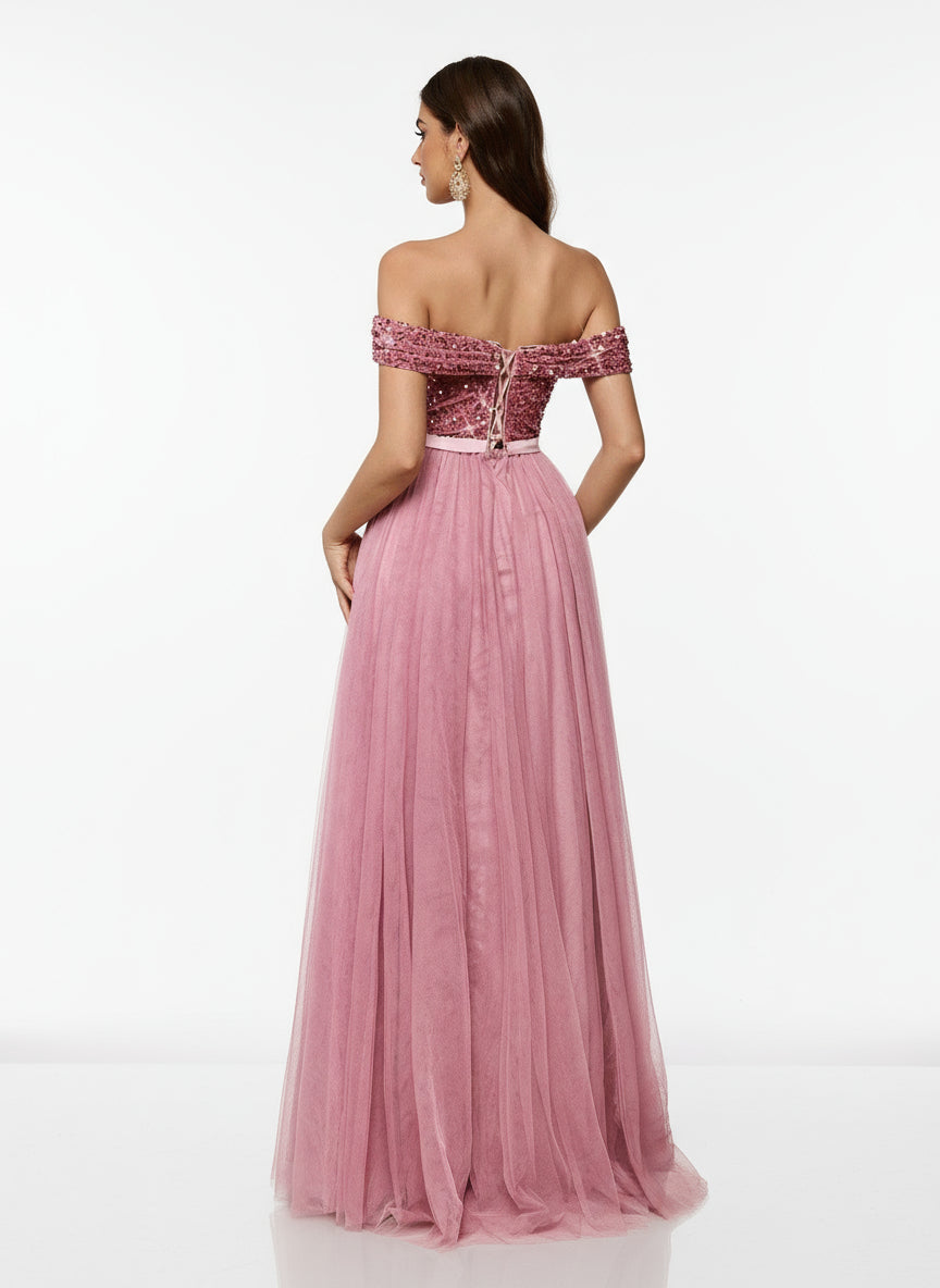 Romantisches Schulterfreies Abendkleid aus Mesh mit Pailletten und Patchwork