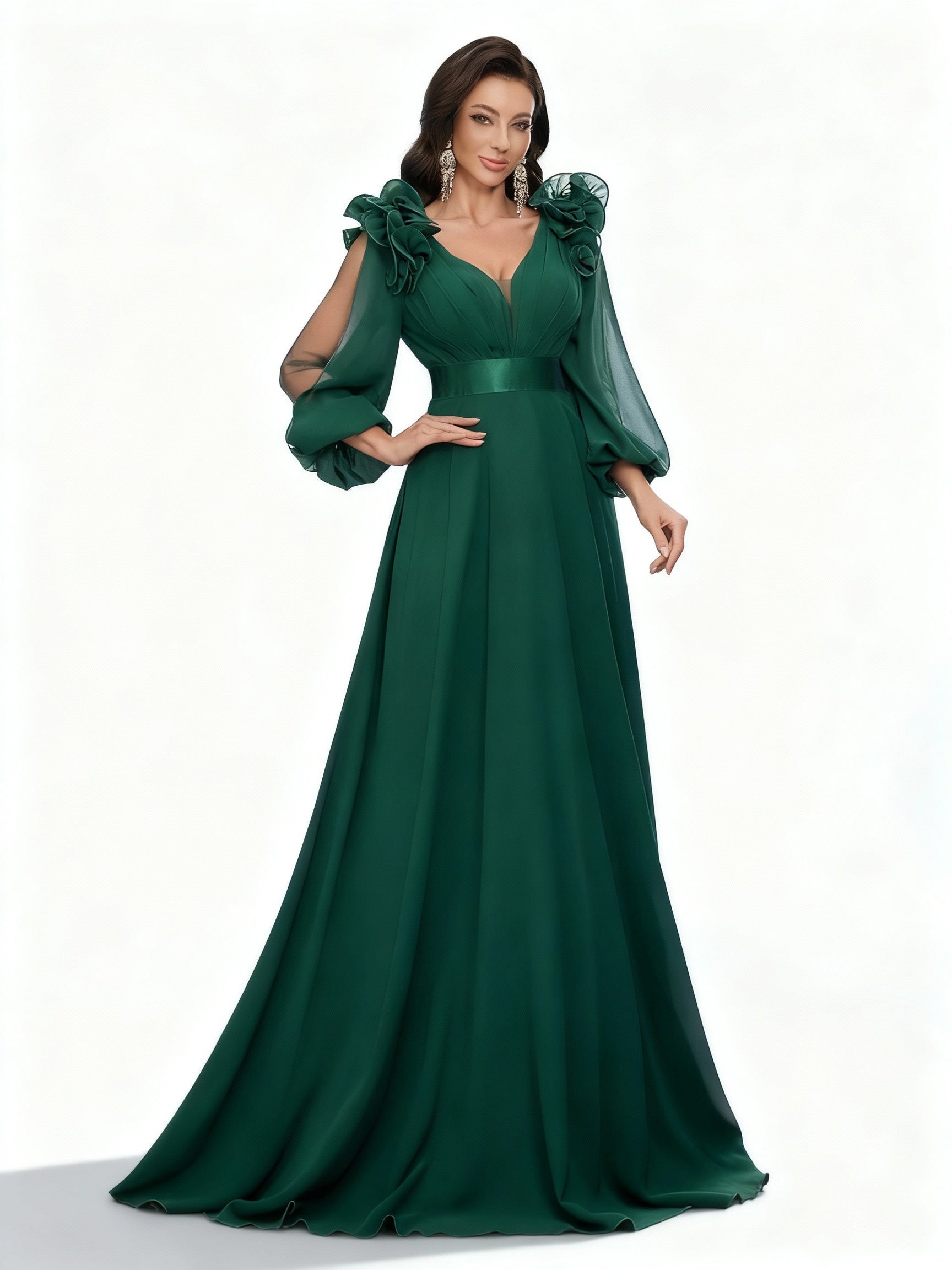 Dunkelgrünes Chiffonkleid mit Laternenärmeln in Maxilänge