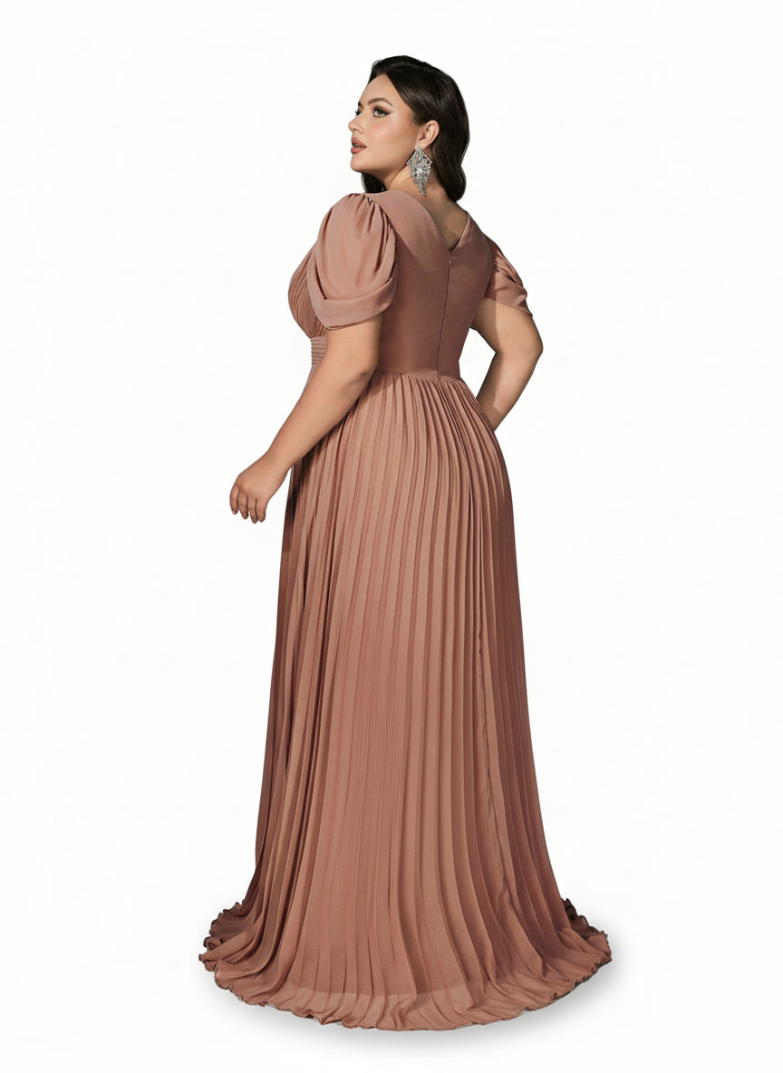 Dieses elegante plissierte Brautjungfernkleid vereint Stil und Raffinesse. Der tiefe V-Ausschnitt und die zarten Flügelärmel schaffen eine feminine Silhouette, während der fließende Stoff für eine anmutige Bewegung sorgt – perfekt für feierliche Anlässe.