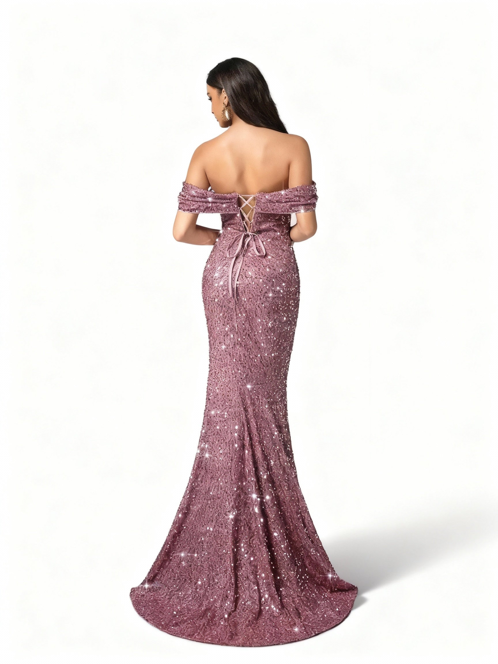 Ein romantisches One-Shoulder Kleid in Rosé mit herzförmigem Ausschnitt, funkelnden Pailletten und hohem Schlitz für feminine Dramatik.