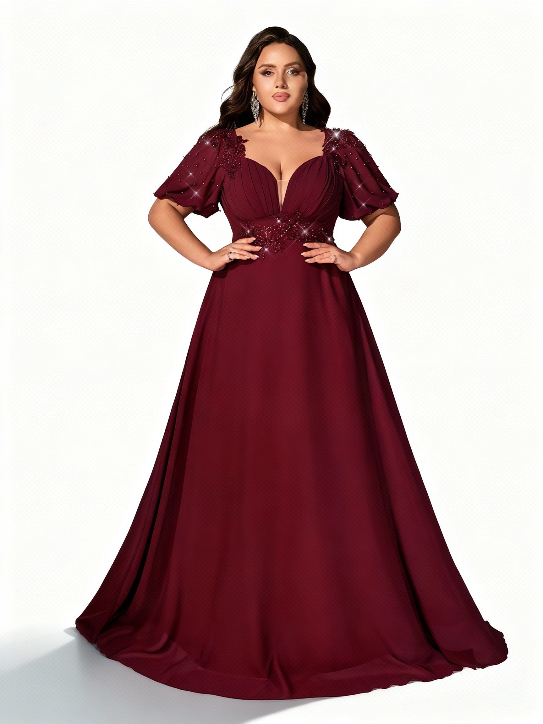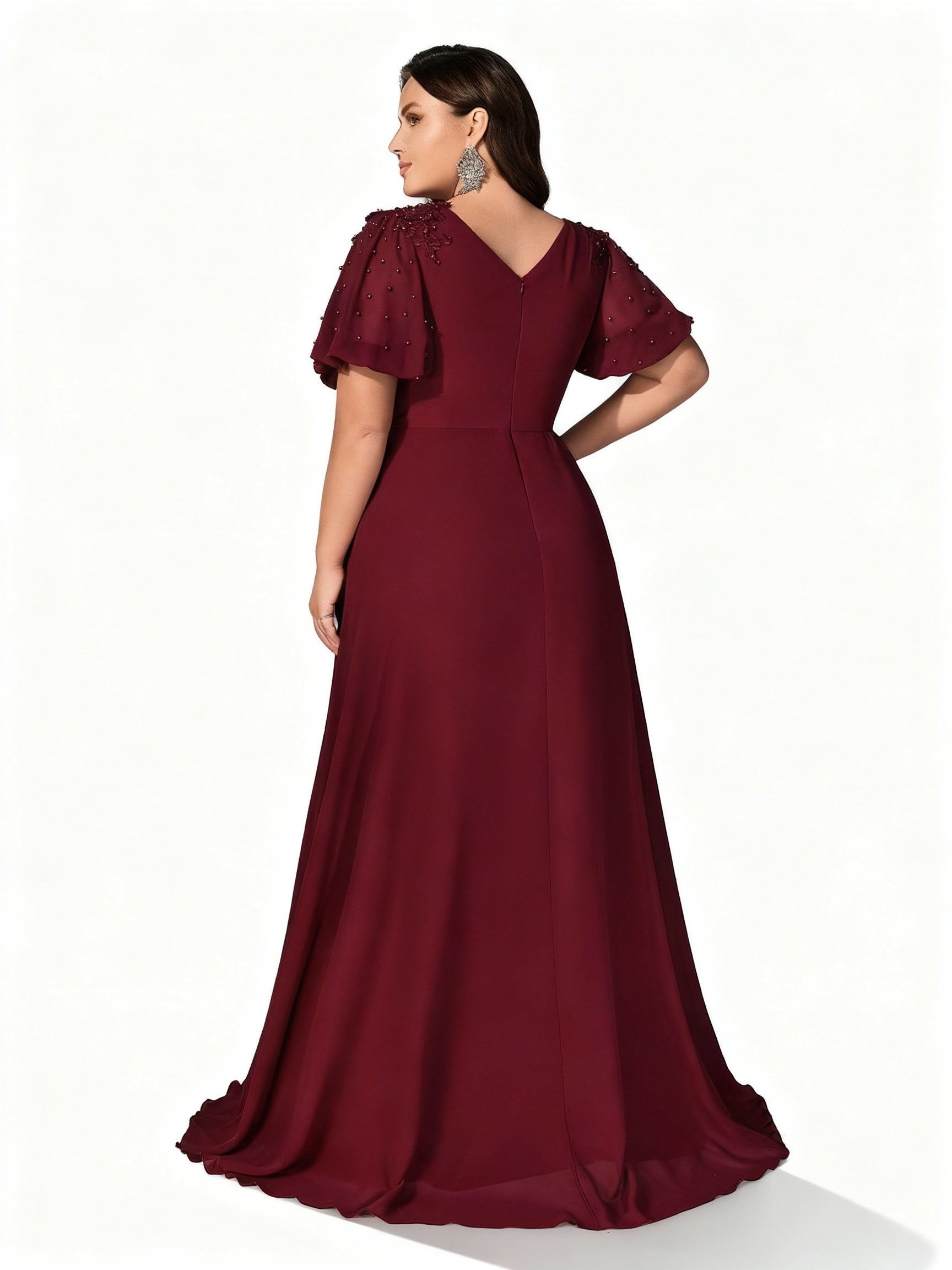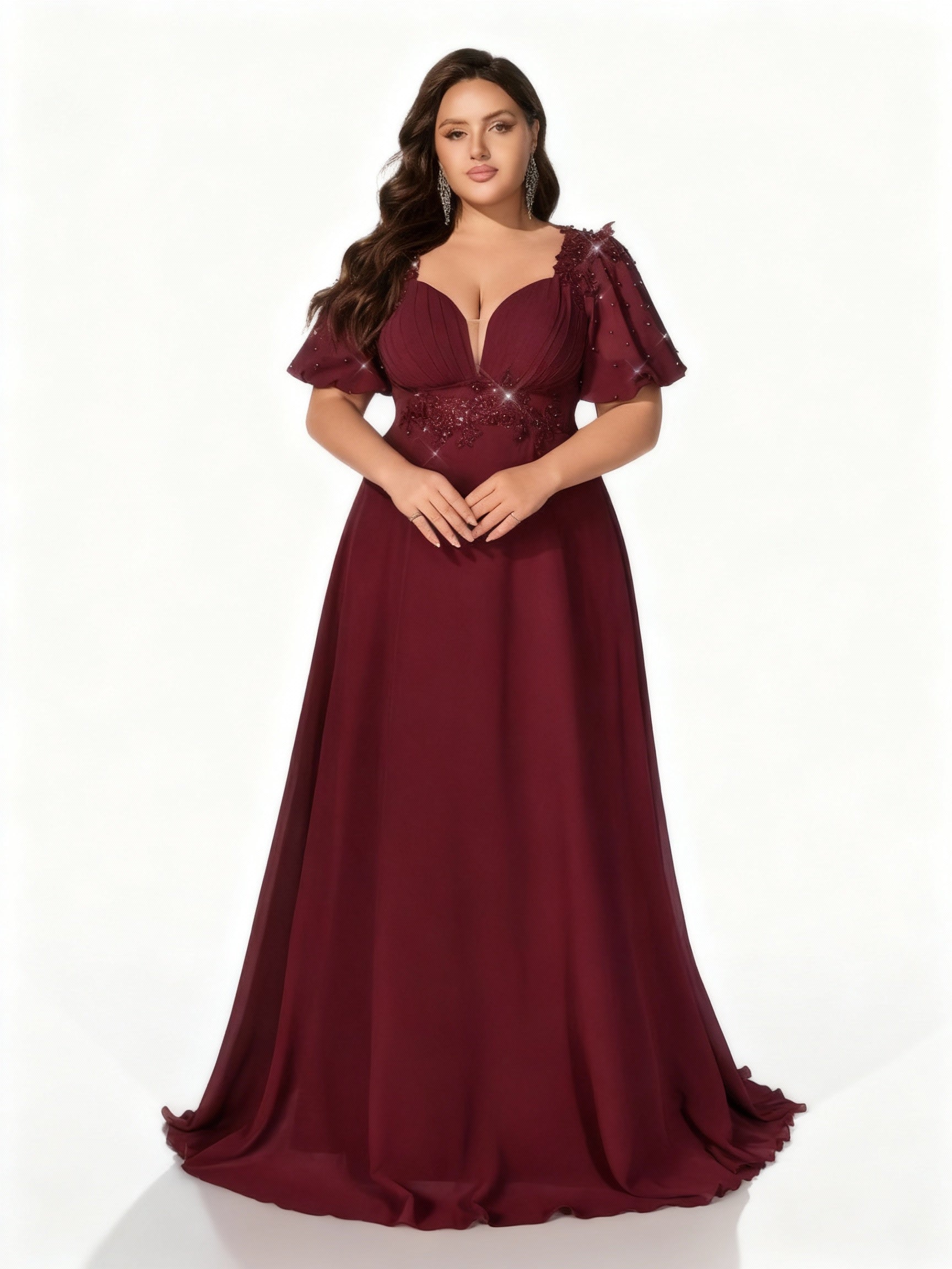 Ein klassisches burgunderrotes Chiffon-Abendkleid mit tiefem V-Ausschnitt und eleganten Volantärmeln. Der fließende Stoff sorgt für eine feminine, schmeichelhafte Silhouette.