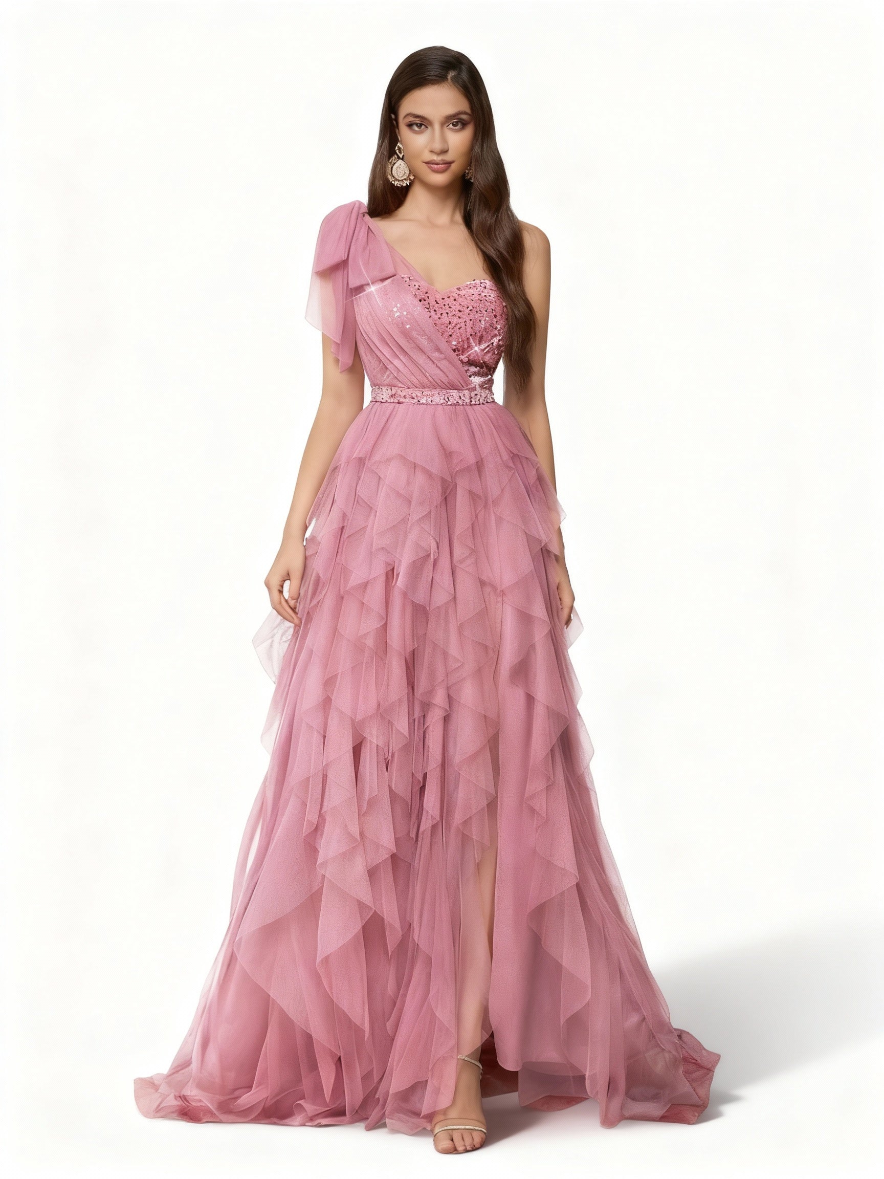 Ein romantisches rosa Abendkleid mit feinen Pailletten und mehrlagigem Meshrock. Der hohe Schlitz sorgt für Eleganz mit einem Hauch von Verführung.