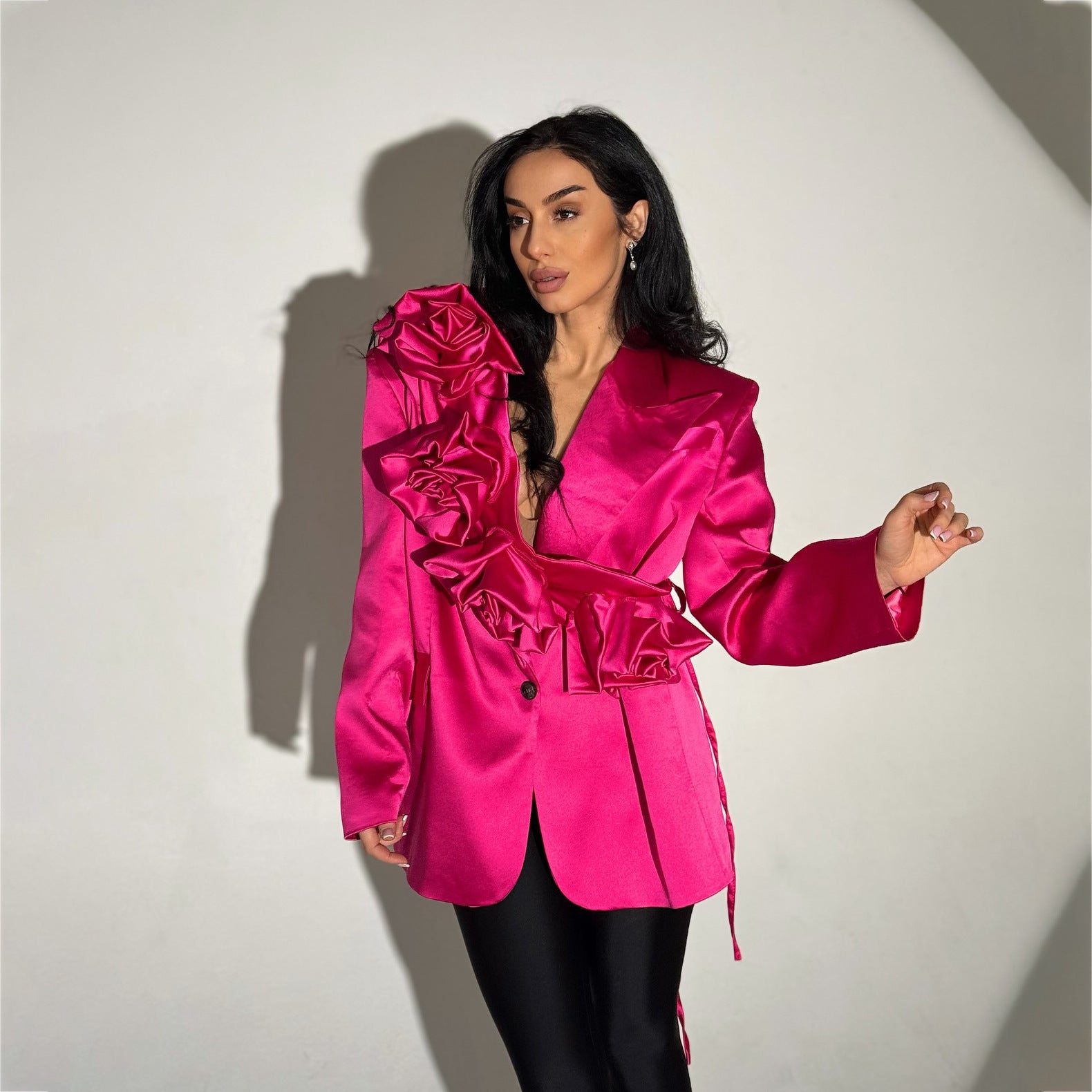 • Design: Der Blazer besticht mit auffälligen Rüschendetails, die eine feminine Silhouette betonen und einen einzigartigen Look kreieren.