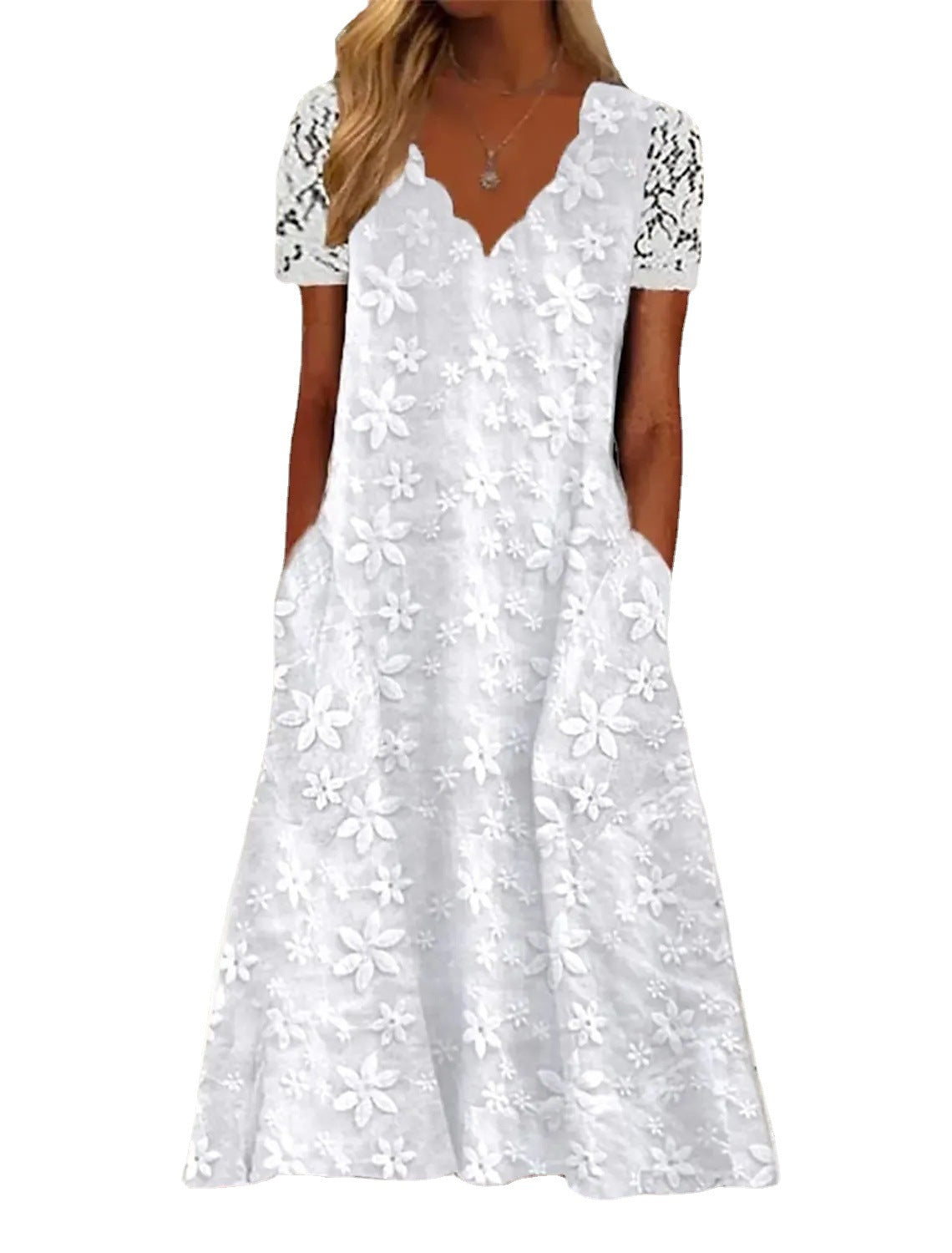Die zarten Blumenstickereien verleihen dem Kleid eine romantische Note und machen es ideal für verschiedene Anlässe, von Sommerfesten bis entspannten Picknicks im Freien.