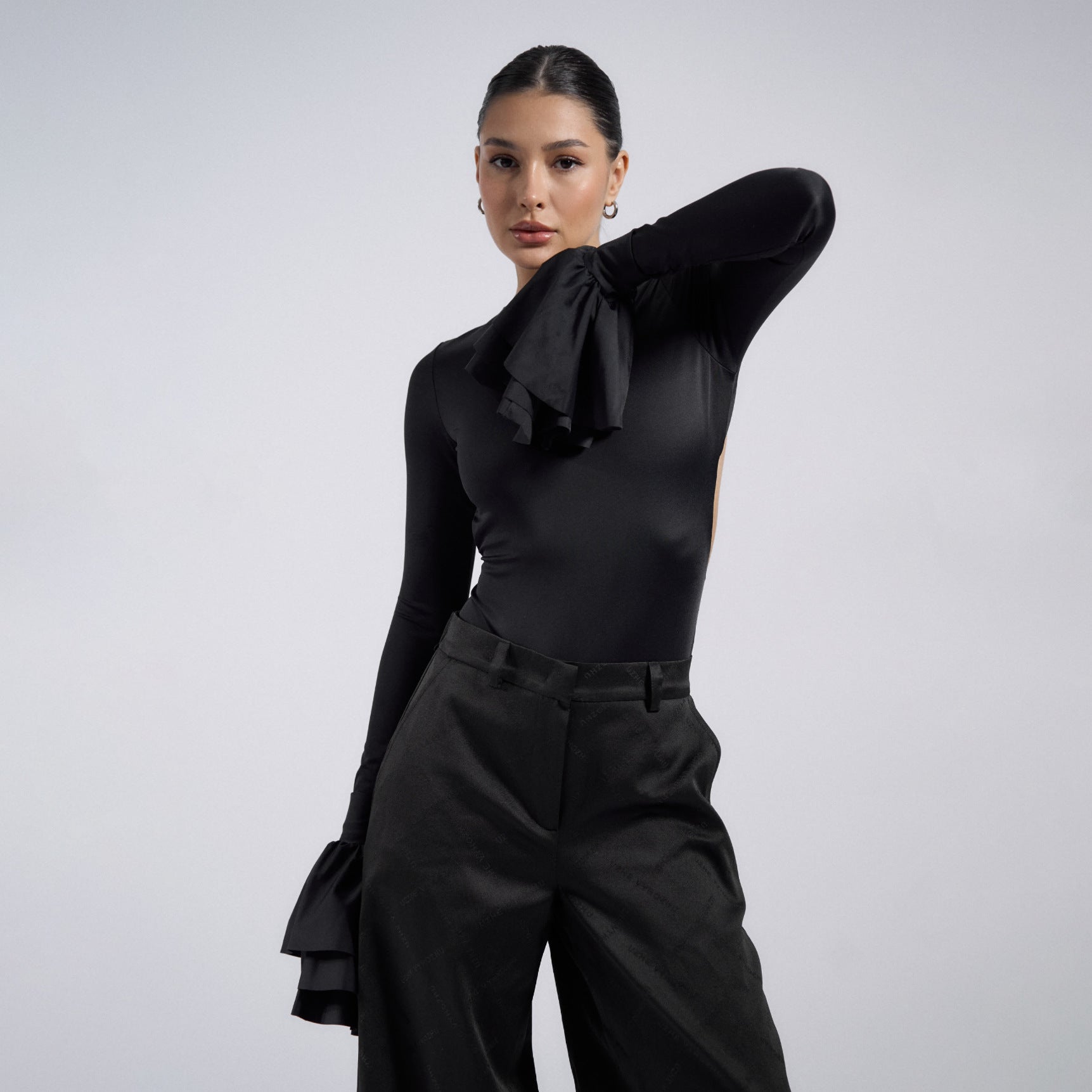 Entdecken Sie den luxuriösen Damen Body mit einzigartigen Details, der perfekt für stilbewusste Frauen geeignet ist. Mit seinen eleganten Volantärmeln bringt dieses Kleidungsstück eine exquisite Note in jede Garderobe.