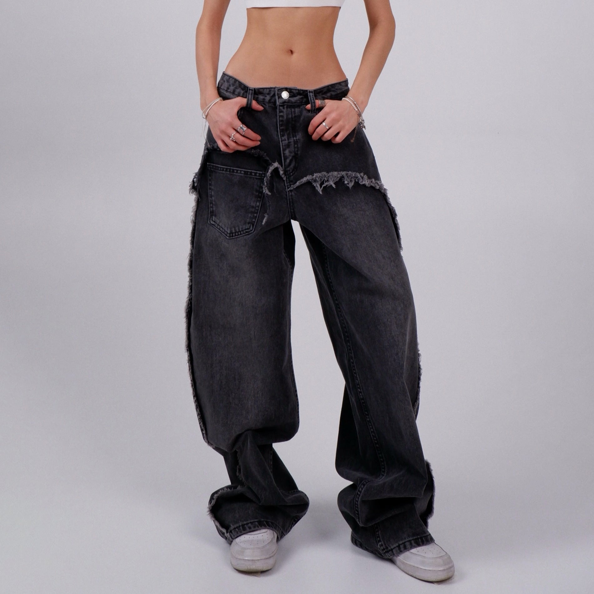 Diese einzigartigen Damen Jeans bieten sowohl Stil als auch Komfort und sind ideal für jede Gelegenheit. Mit ihrem lässigen, breiten Bein und den auffälligen fransigen Abschlüssen sind sie ein absolutes Must-have für modebewusste Frauen.