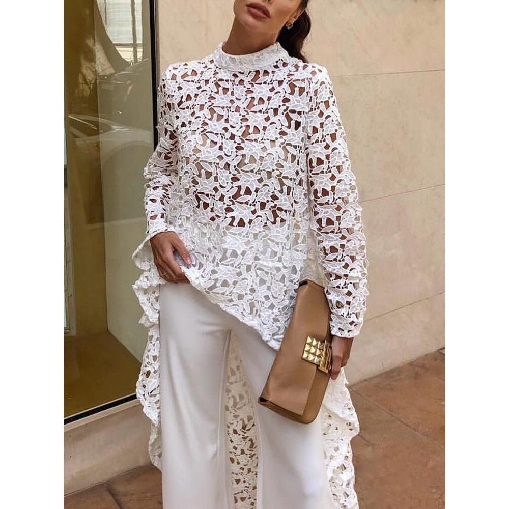 Entdecken Sie unser edles Spitzenoberteil, das mit einem einzigartigen asymmetrischen Saum und raffinierten Volant-Details begeistert. Dieses Oberteil vereint Eleganz und Tragekomfort und eignet sich hervorragend für besondere Anlässe oder stilvolle Alltagslooks.