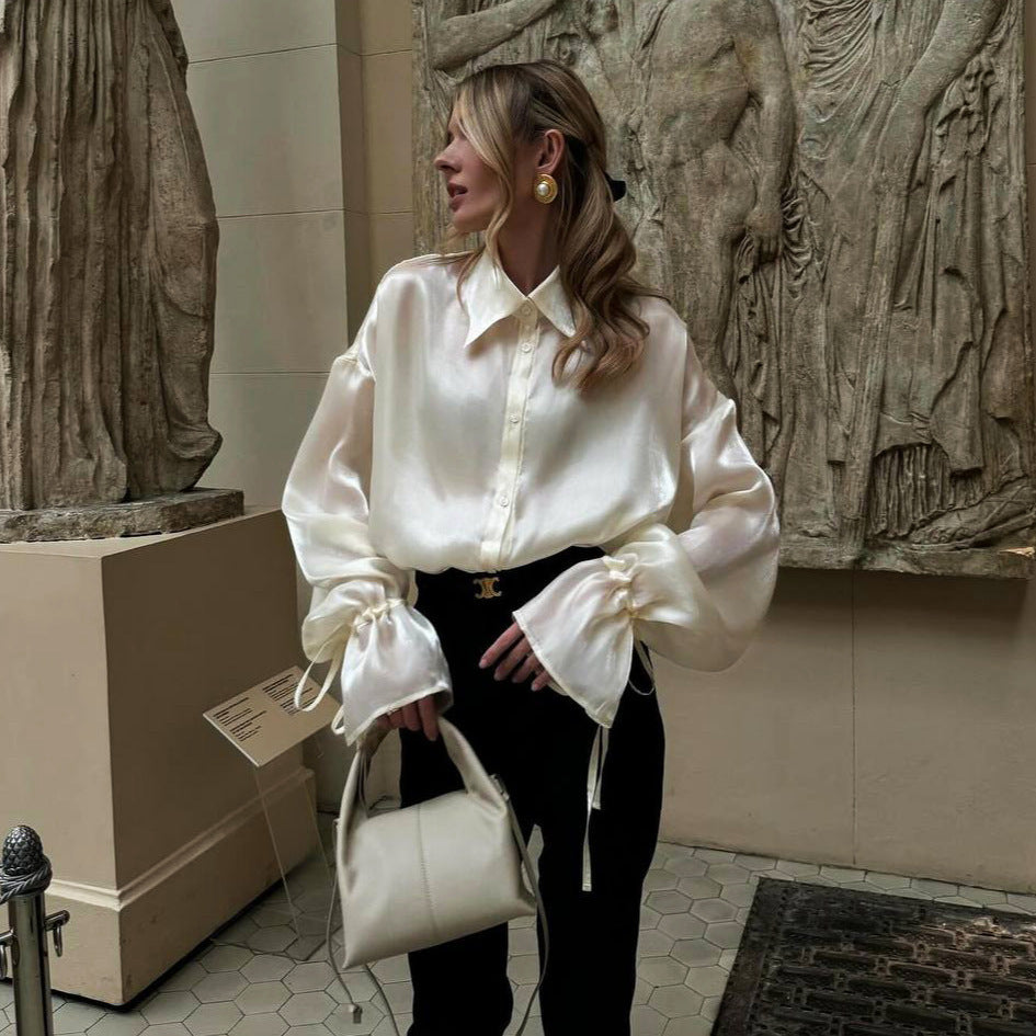Damen Elegant geschnittene Satin-Bluse mit voluminösen Ärmeln und Binde-Details Stalluxe