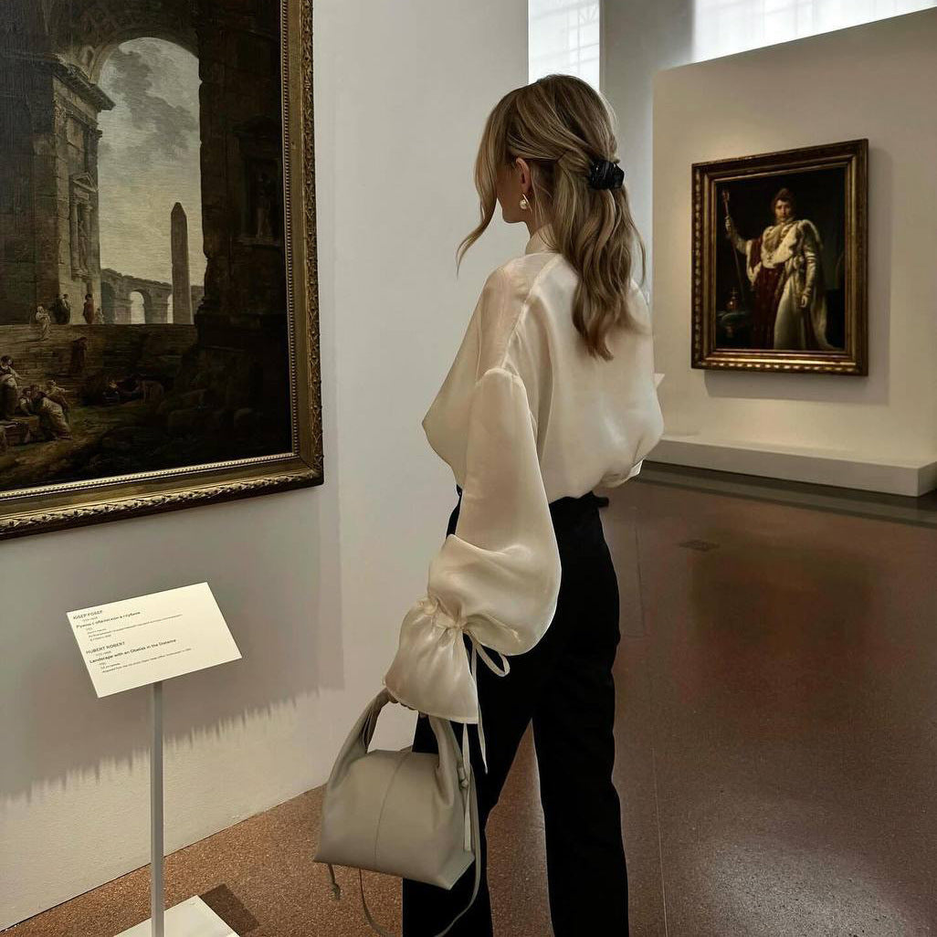 • Ärmel: Voluminöse Ärmel mit stilvollen Binde-Details, die der Bluse einen einzigartigen Charakter verleihen.