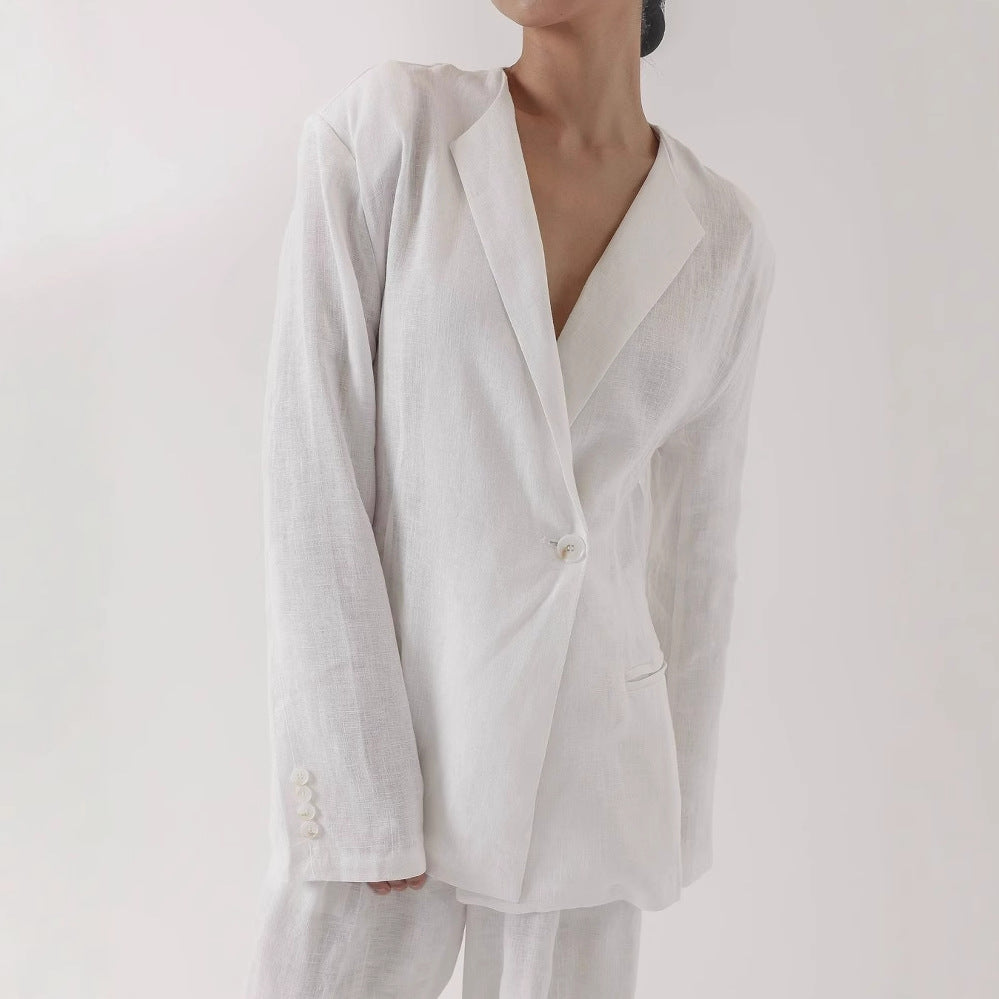 Verleihen Sie Ihrer Garderobe mit diesem eleganten und vielseitigen Leinenanzug-Set von Stalluxe einen frischen Touch!