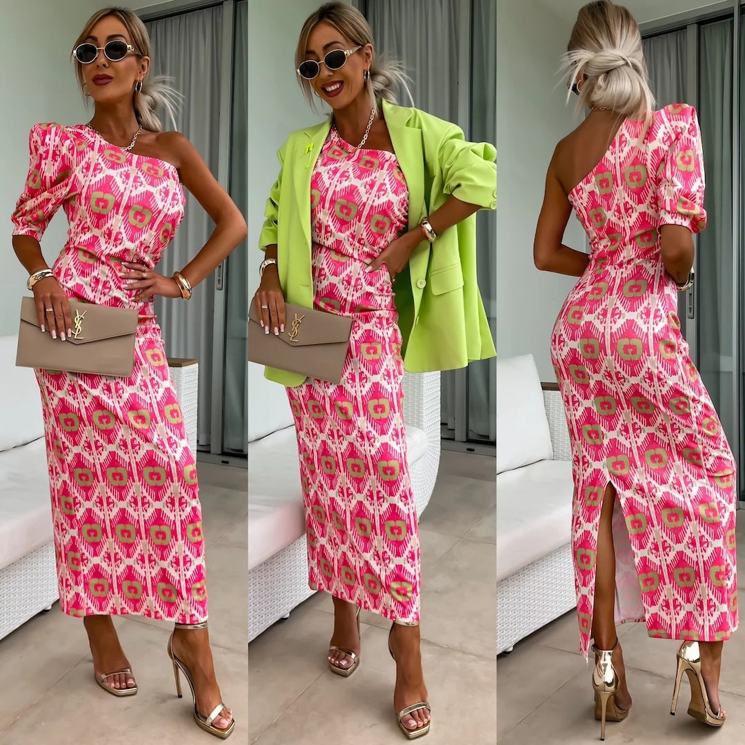 Das Damen Etuikleid mit asymmetrischem Ausschnitt und Puffärmeln ist die perfekte Wahl für besondere Anlässe oder die nächste Sommerparty. Das einzigartige Design und die auffälligen Farben verleihen Ihnen einen glamourösen Look.