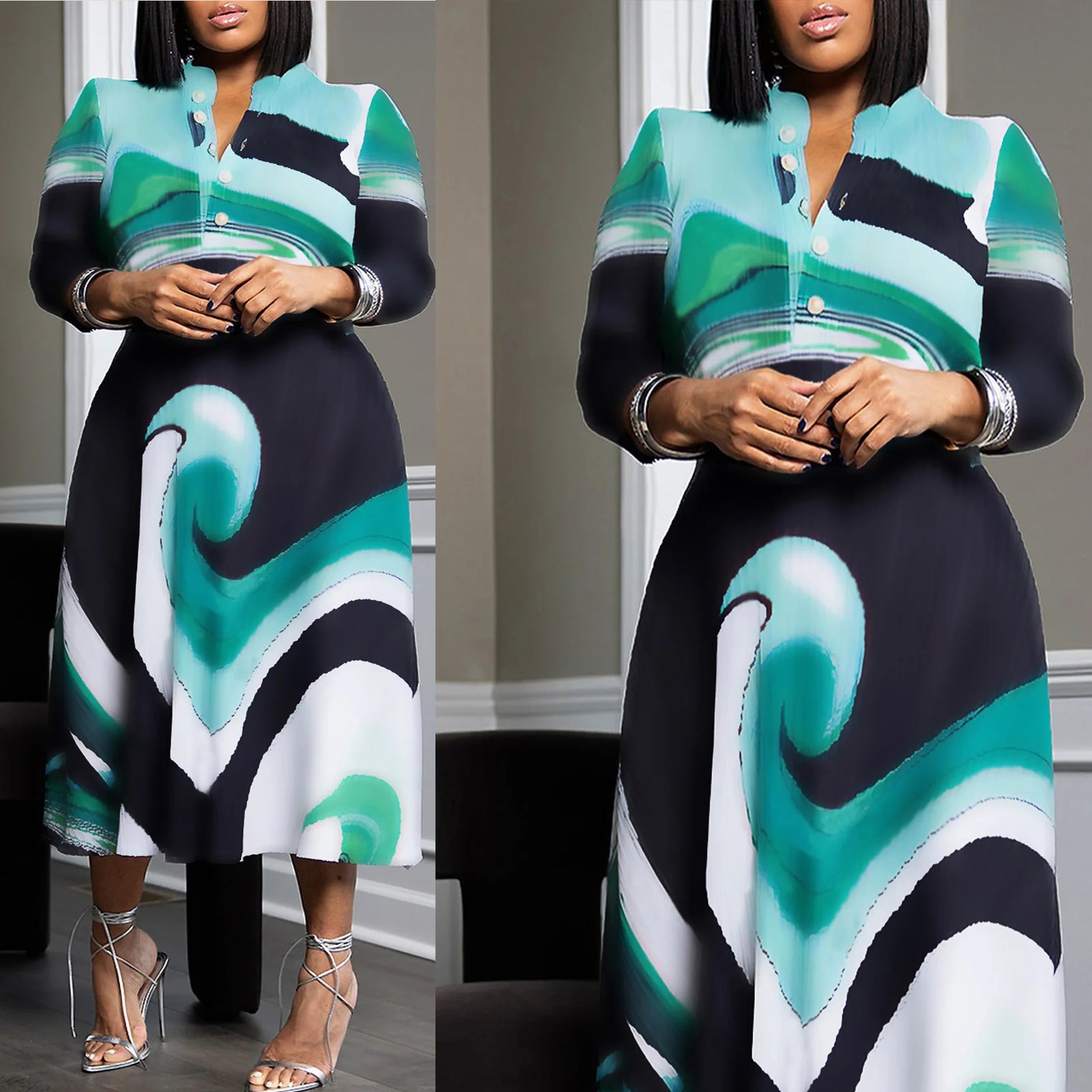 • Praktische Details: Knopfdetails an der Vorderseite und ein schöner Stehkragen verleihen dem Kleid eine raffinierte Note.