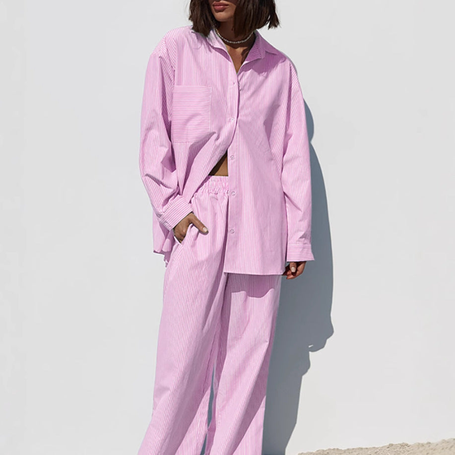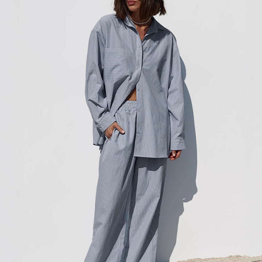 • Praktische Details: Die Bluse verfügt über eine Brusttasche und eine durchgehende Knopfleiste, während die Hose mit einem elastischen Bund für optimale Passform ausgestattet ist.