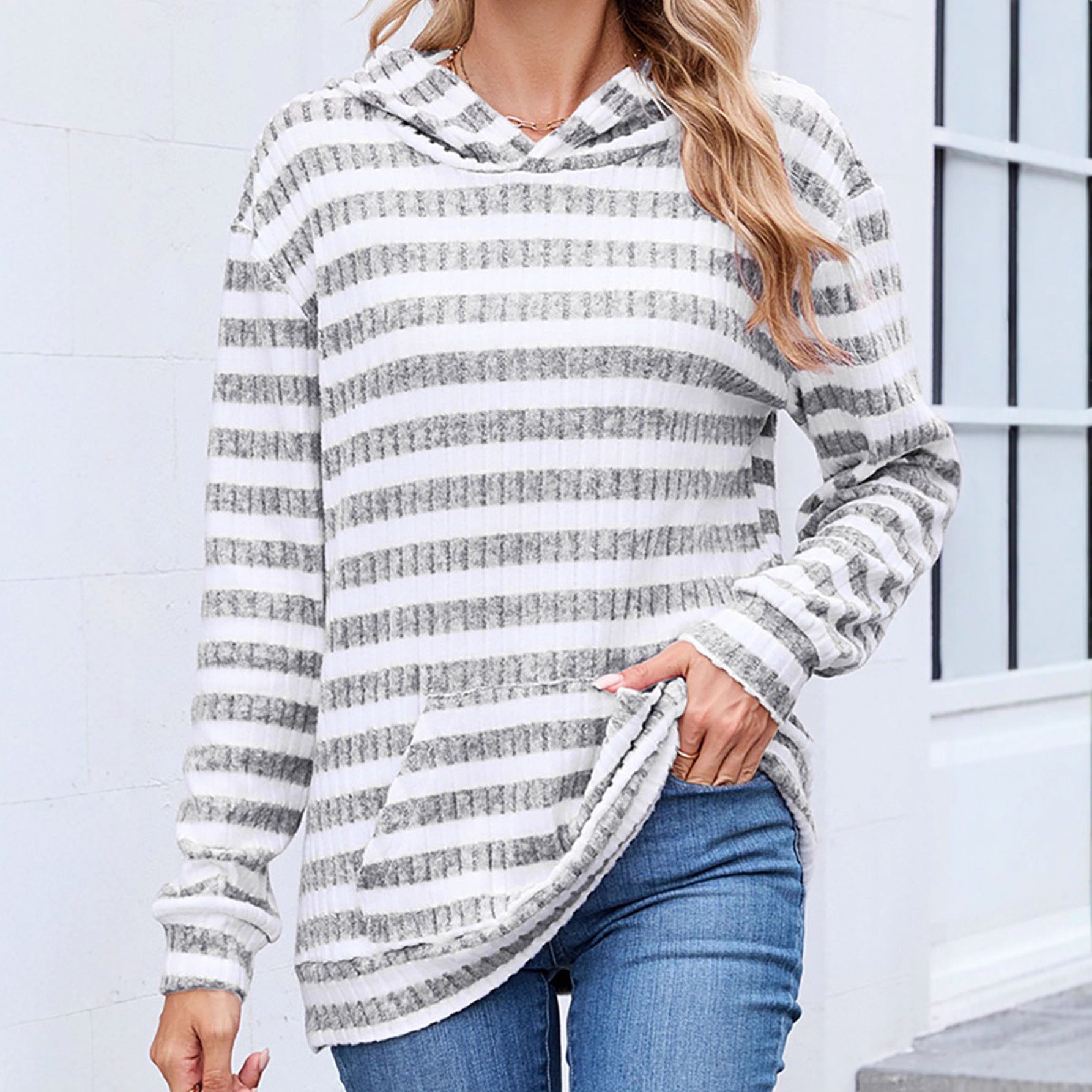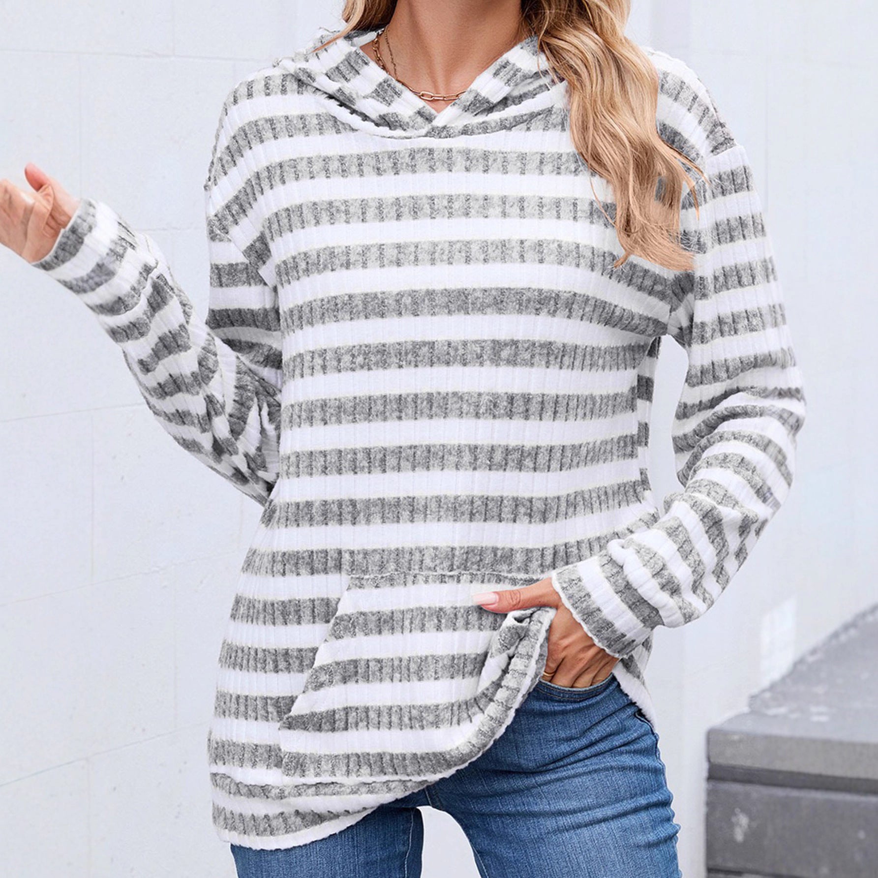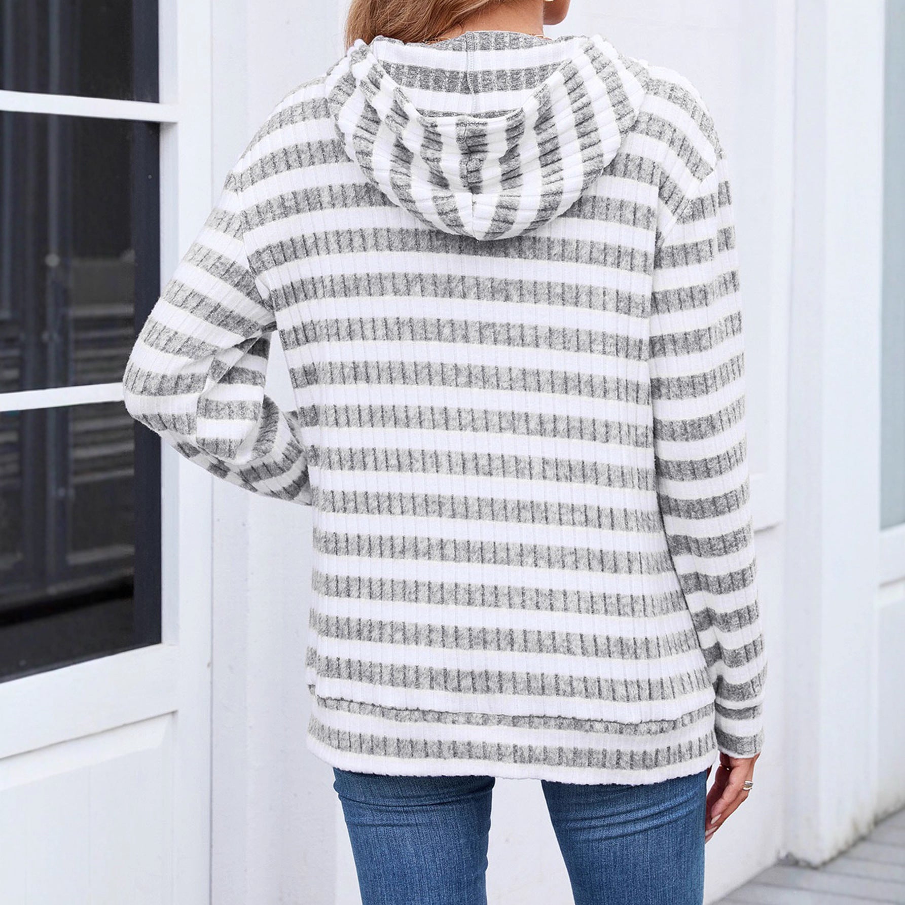 Entdecken Sie unser stilvolles Damen Kapuzenoberteil mit lässigem Streifenmuster, perfekt für den Alltag und entspannte Wochenendausflüge. Dieses gemütliche Oberteil verbindet Stil und Komfort auf harmonische Weise.
