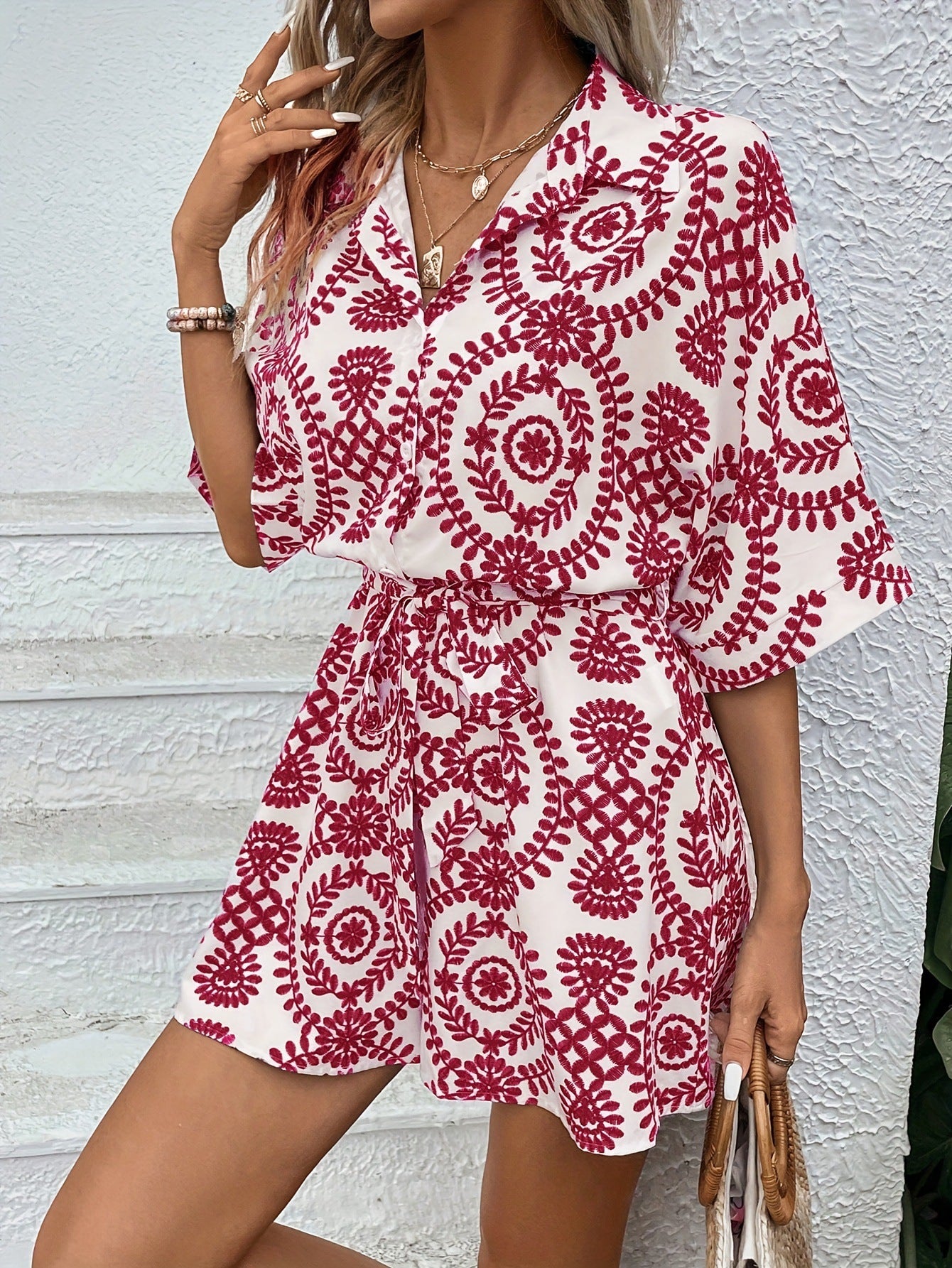 Entdecken Sie unseren eleganten Damen kurzärmligen Einteiler mit Taillengürtel und floralem Muster, der ideal für sommerliche Anlässe ist. Dieser Einteiler kombiniert Stil und Komfort auf perfekte Weise.
