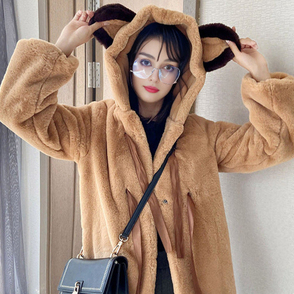 Damen Kuschelige Kunstpelzjacke mit Kapuze und Schleifendetails Stalluxe
