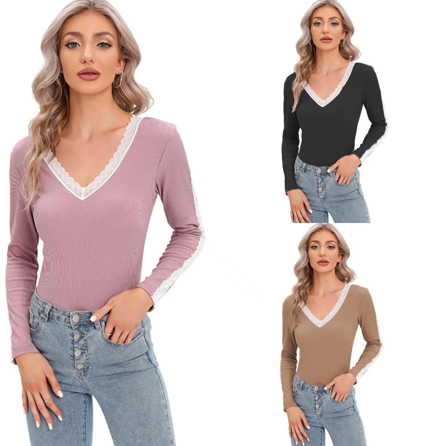 Damen Langarmoberteil mit V-Ausschnitt und Spitzenakzenten Stalluxe