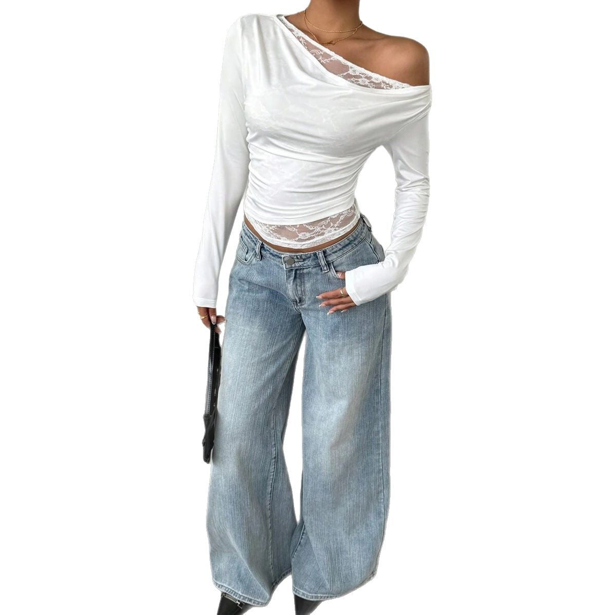 Damen Lässiges Langarmoberteil mit asymmetrischem Ausschnitt und transparenten Details Stalluxe