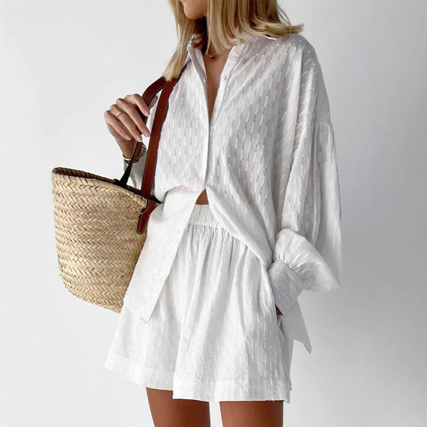 Entdecken Sie das perfekte Outfit für warme Tage mit unserem lässigen Zweiteiler-Set aus atmungsaktivem Stoff. Die Kombination aus einem lockeren Shirt und einer schicken, kurzen Hose bietet nicht nur Komfort, sondern auch Stil.