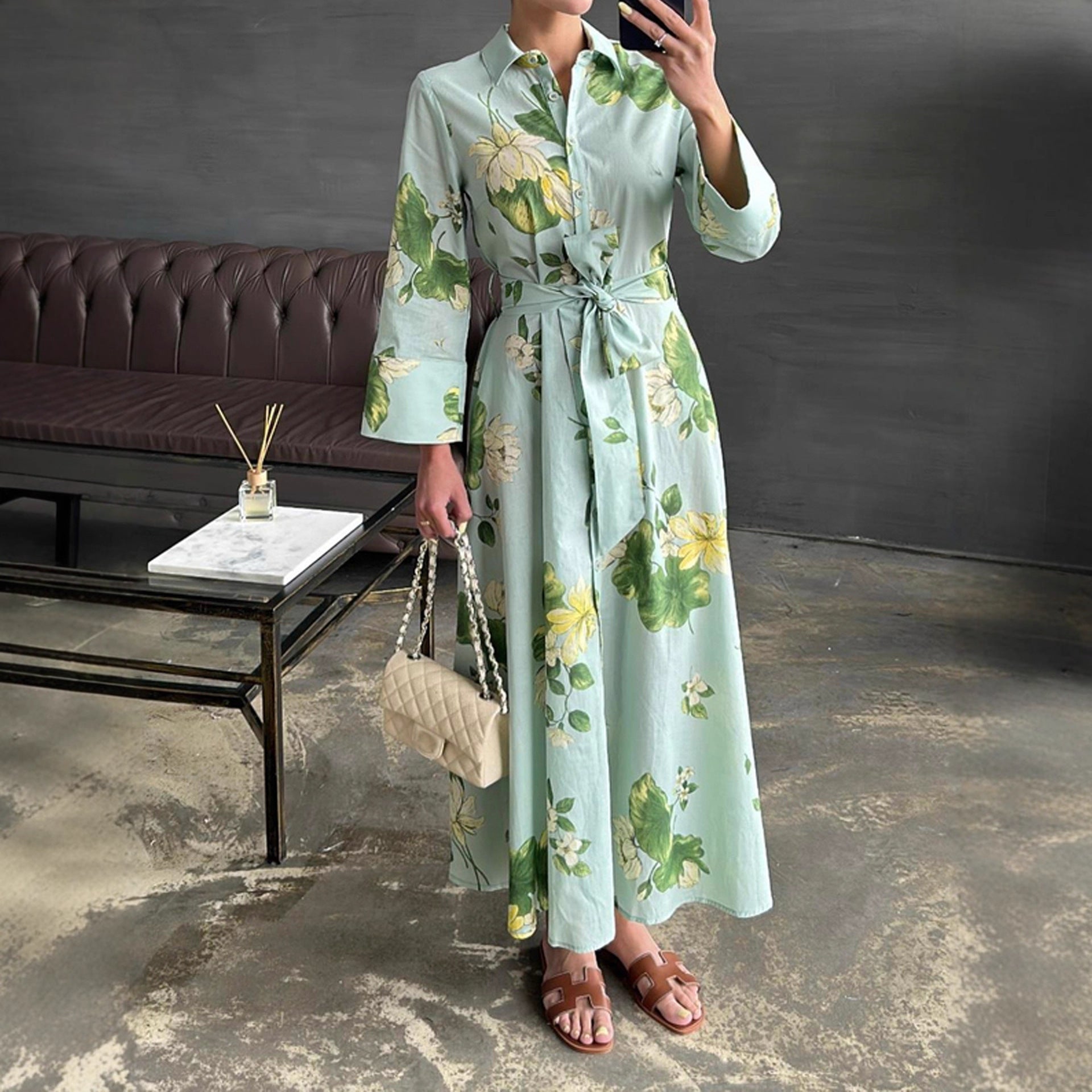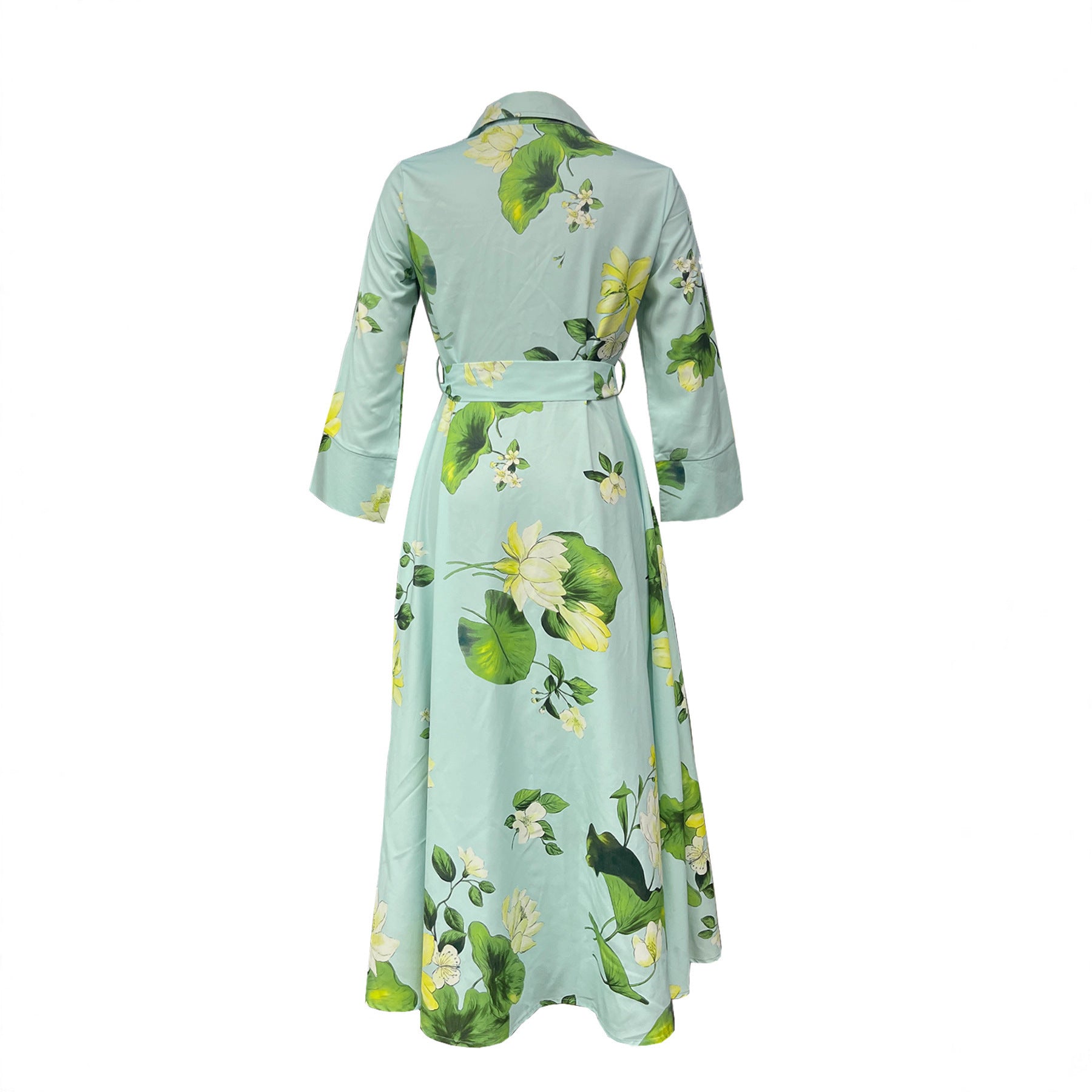 Mit einem modischen Wickelgürtel betont es die Taille und sorgt für eine feminine Silhouette. Die langen Ärmel und der klassischer Kragen verleihen dem Kleid einen Hauch von Eleganz, während das floral gestaltete Design für einen frischen und verspielten Look sorgt.