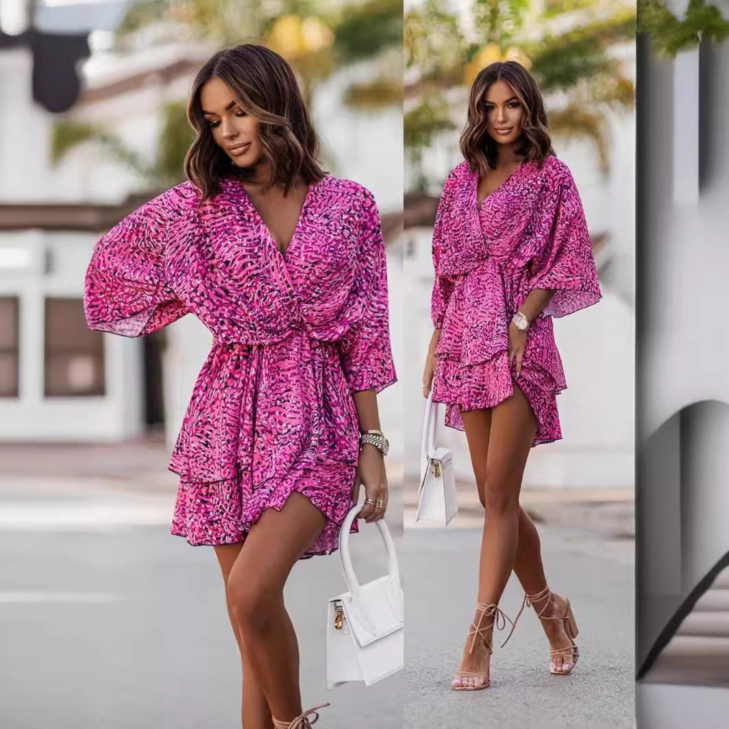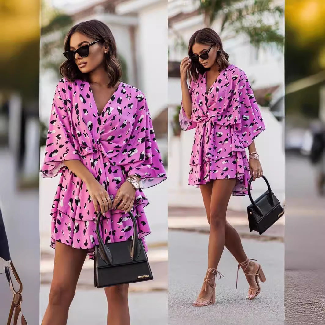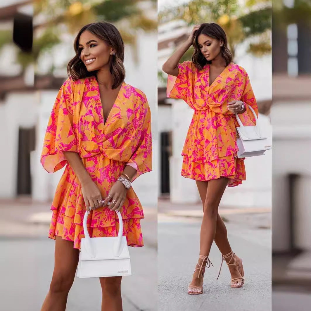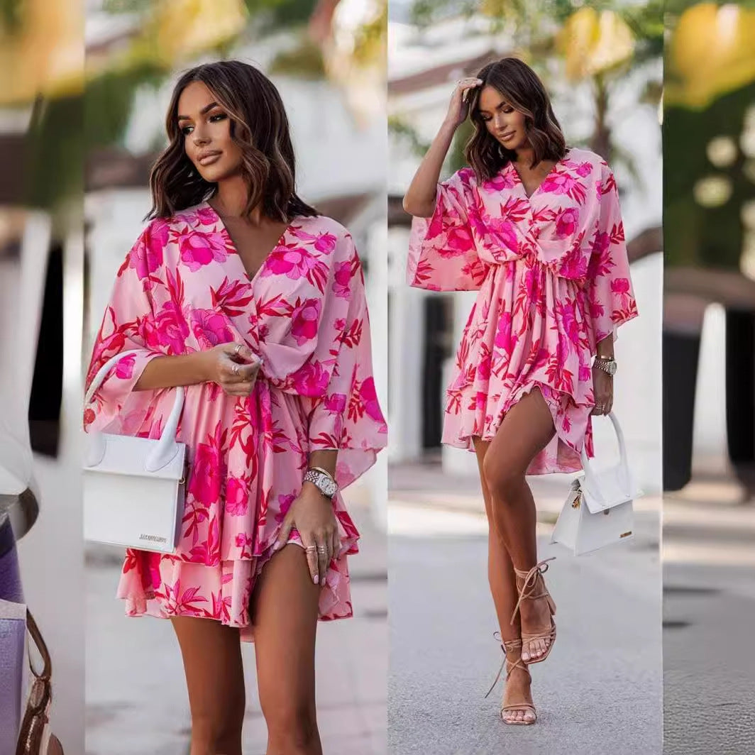 • Modisches Design: Farbige Blumenmuster und voluminöse Ärmel verleihen diesem Kleid einen frischen, modernen Look.
