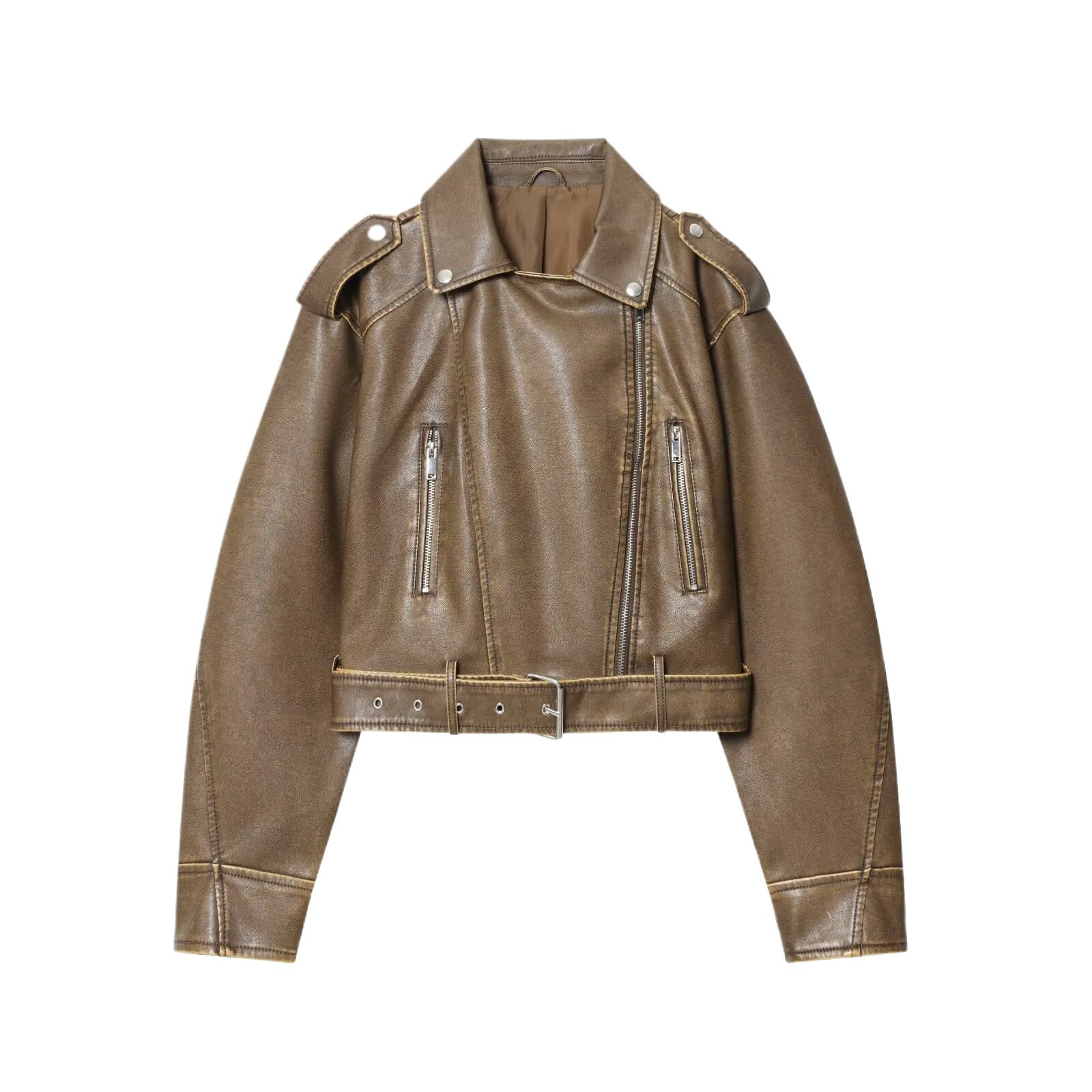 Damen modische Bikerjacke im Vintage-Look mit Taillengürtel und Reißverschlusstaschen Stalluxe