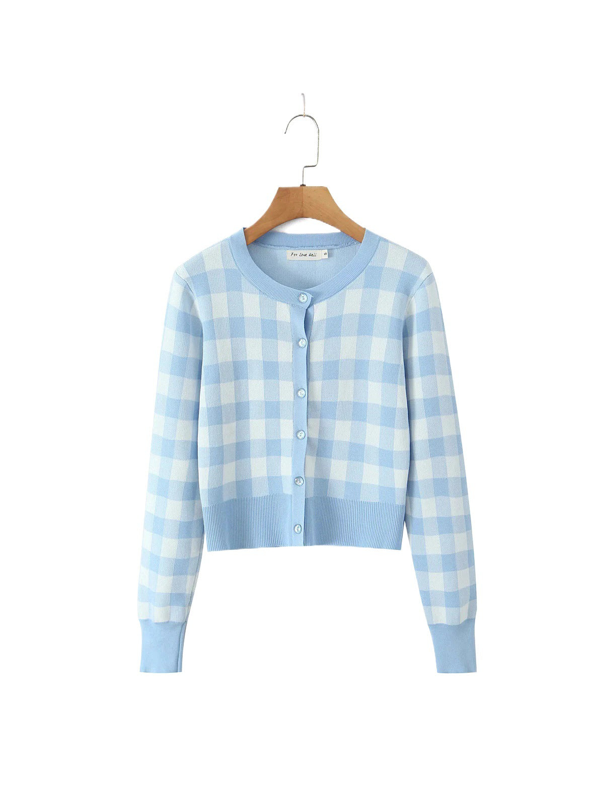 Damen modischer karierten Strickjacke mit Rundhalsausschnitt und Knopfverschluss Stalluxe