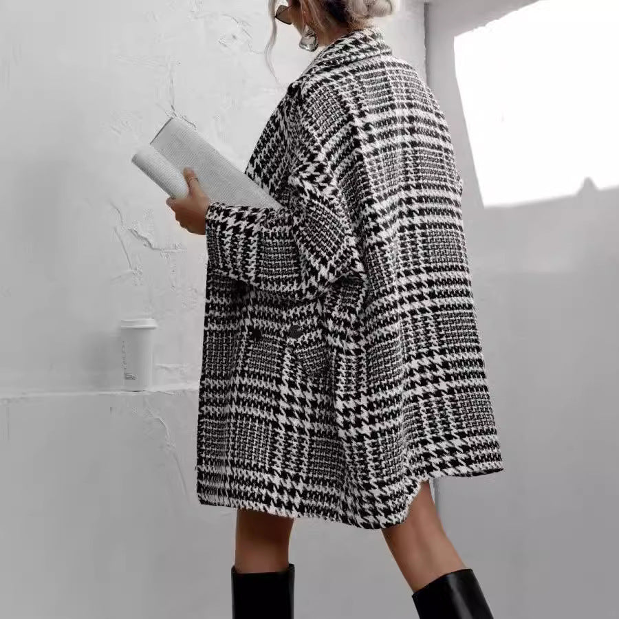 • Design: Das moderne Karomuster in Schwarz und Weiß verleiht dem Mantel eine zeitlose Eleganz und Vielseitigkeit.