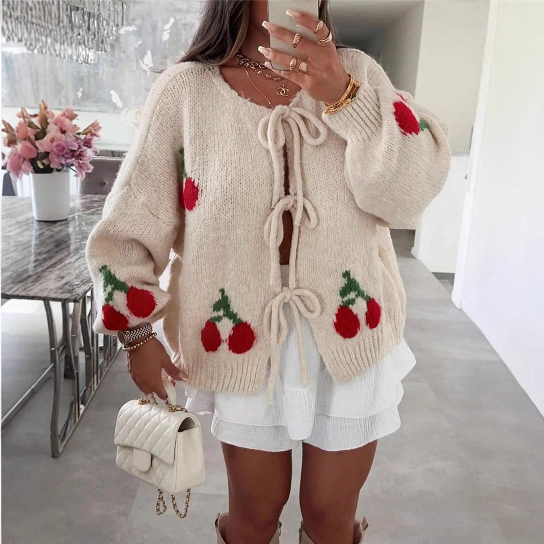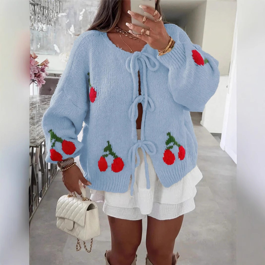 Entdecken Sie unsere bezaubernde Strickjacke für Damen, die mit ihrem einzigartigen Kirschmotiv und den liebevoll gestalteten Schleifchen sofort ins Auge fällt. Sie ist die perfekte Kombinationsmöglichkeit für einen lässigen, aber stilvollen Look.