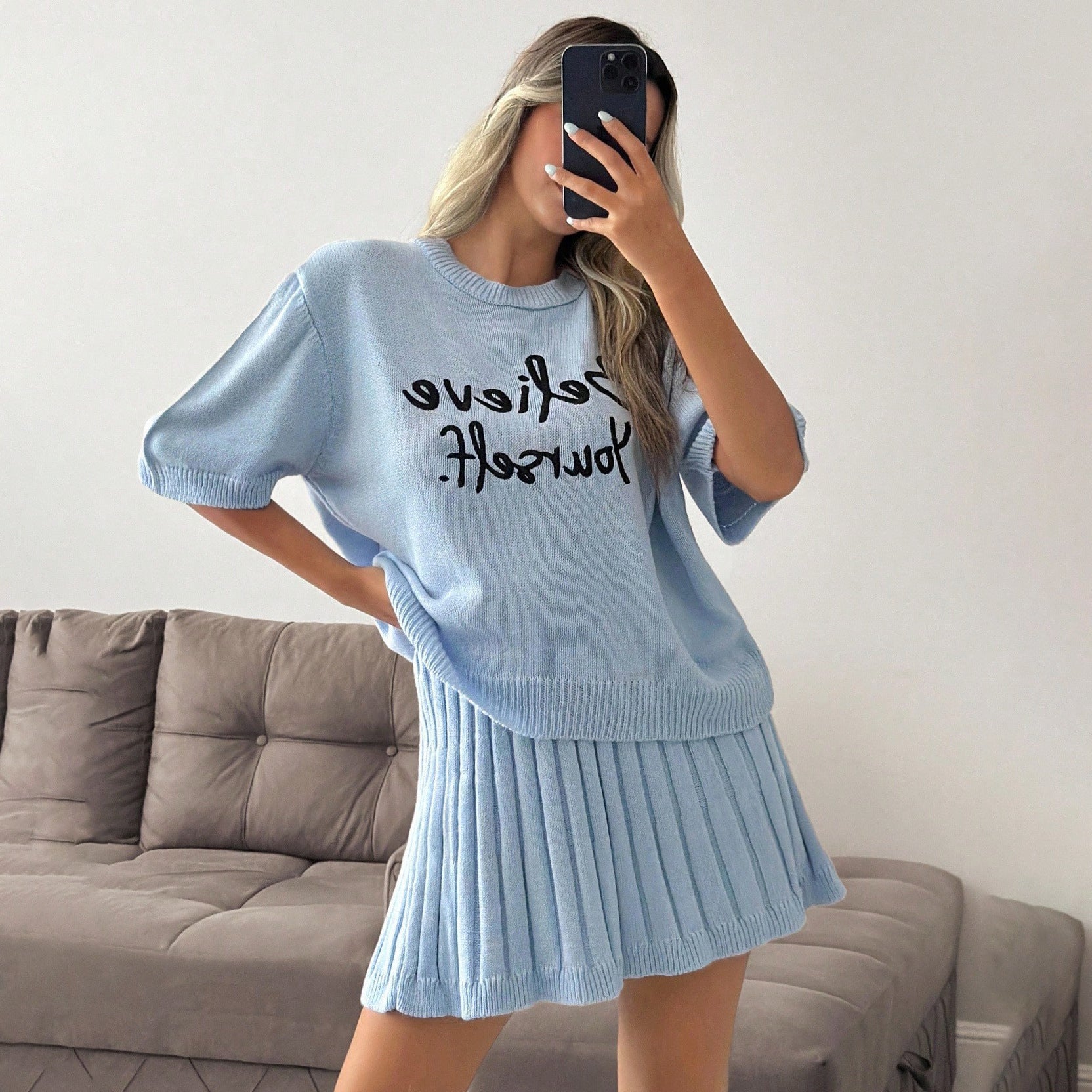 Entdecken Sie unser elegantes Damen Strickkleid mit einzigartigem Faltenrock und grafischem Aufdruck. Dieses Kleid kombiniert modischen Stil mit Komfort und ist perfekt für verschiedene Anlässe.