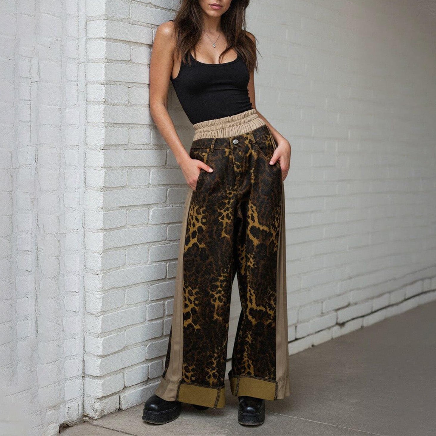 Damen Weite Hose mit Leo-Muster und elastischem Bund Stalluxe