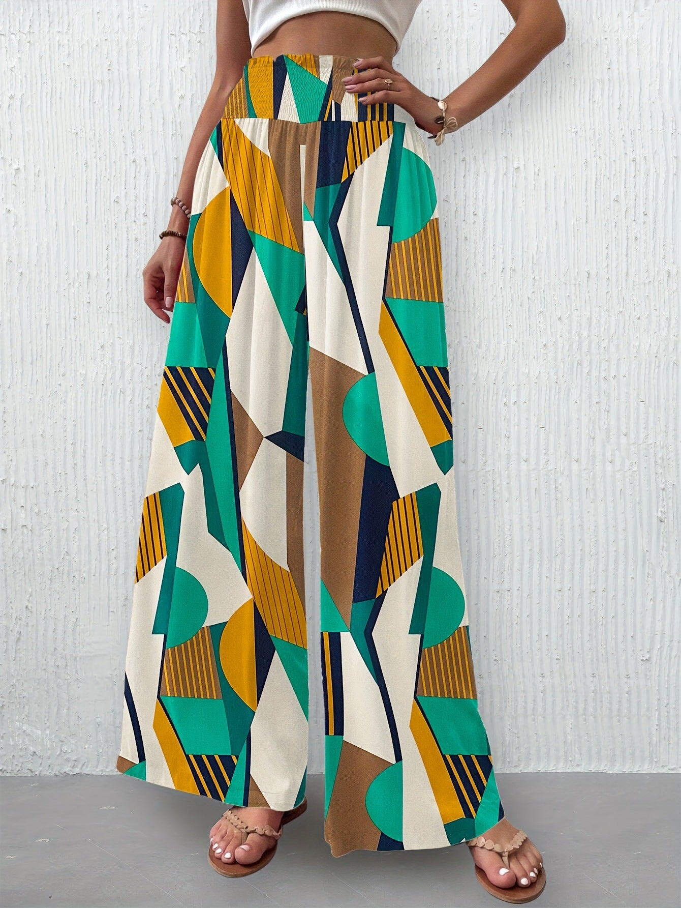 Genießen Sie Leichtigkeit und Komfort mit unserer einzigartigen weiten Sommerhose, die ideal für warme Tage ist. Diese modische Hose bietet nicht nur einen auffälligen geometrischen Print, sondern auch eine bequeme Passform, die sich perfekt für verschiedene Anlässe eignet.