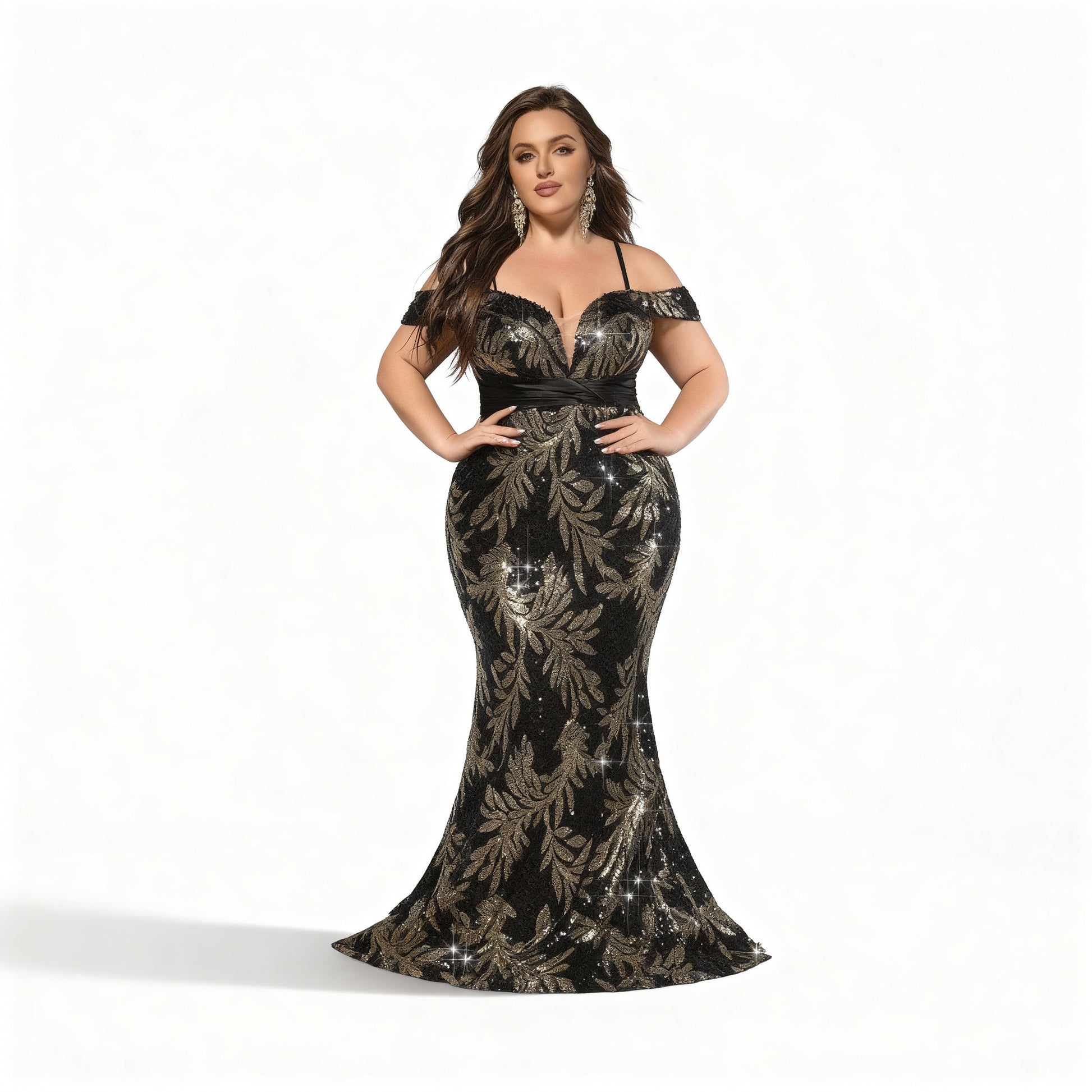 Ein klassisches schwarzes Meerjungfrauenkleid mit feinen Perlenapplikationen und floralem Muster, das Eleganz und Glamour vereint.