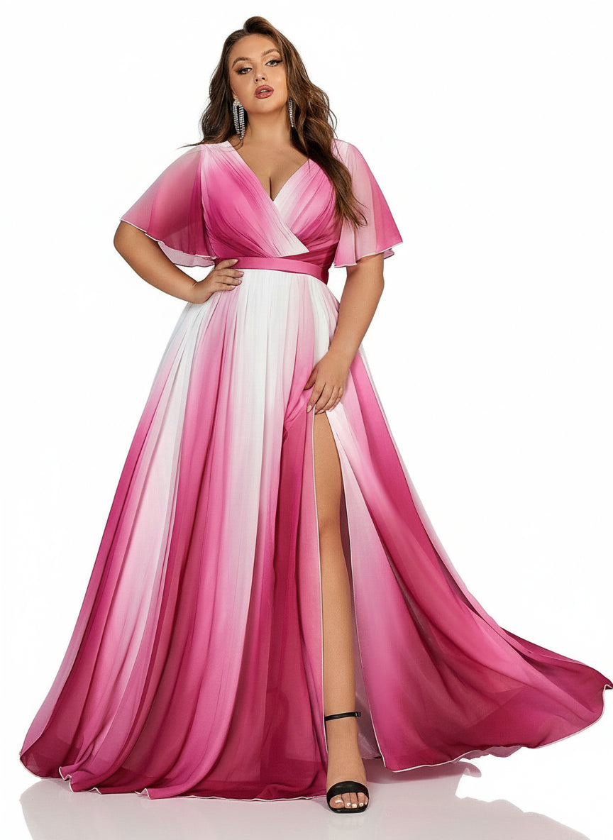 Ein elegantes Abendkleid in Rosenrot mit einem femininen V-Ausschnitt und verspielten Rüschen. Es vereint Eleganz und Romantik in einem zeitlosen Design.