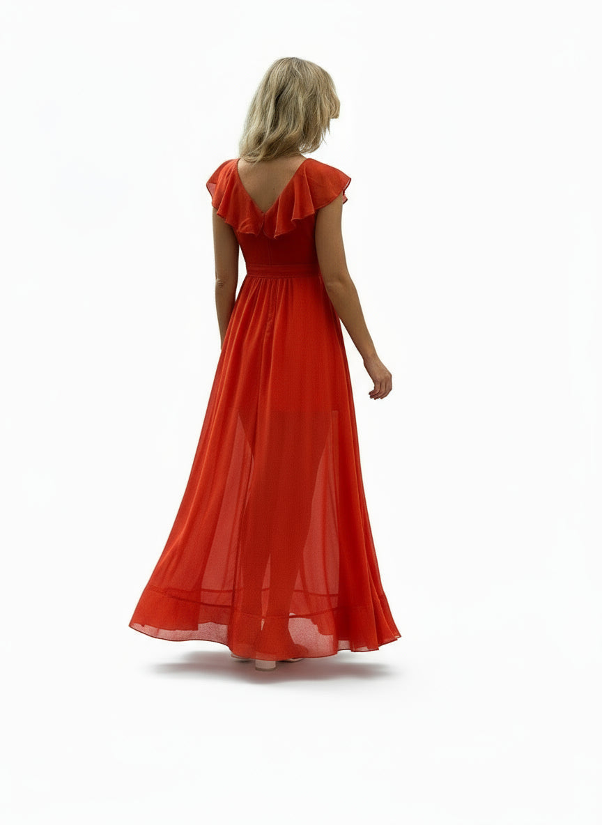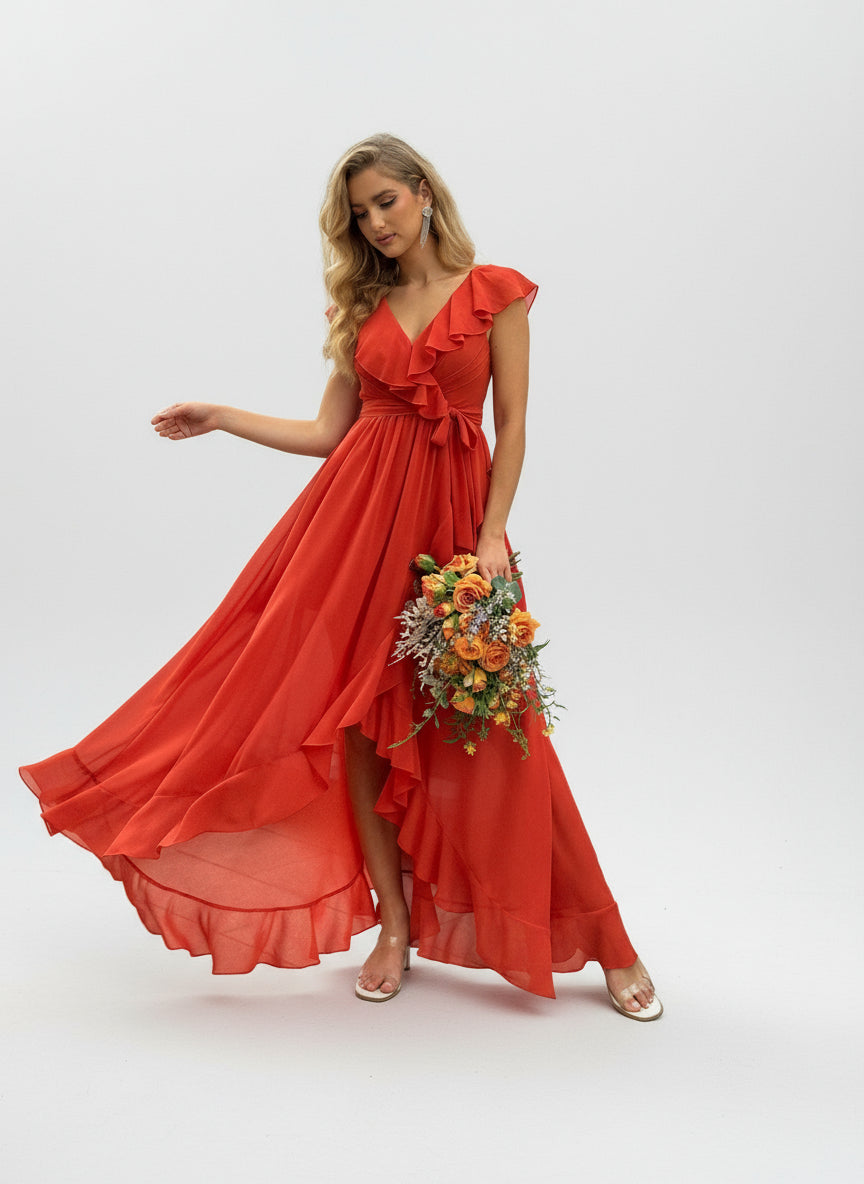 Ein stilvolles korallenfarbenes Brautjungfernkleid mit tiefem V-Ausschnitt und romantischen Volantärmeln. Der fließende Stoff sorgt für eine feminine, weiche Bewegung.