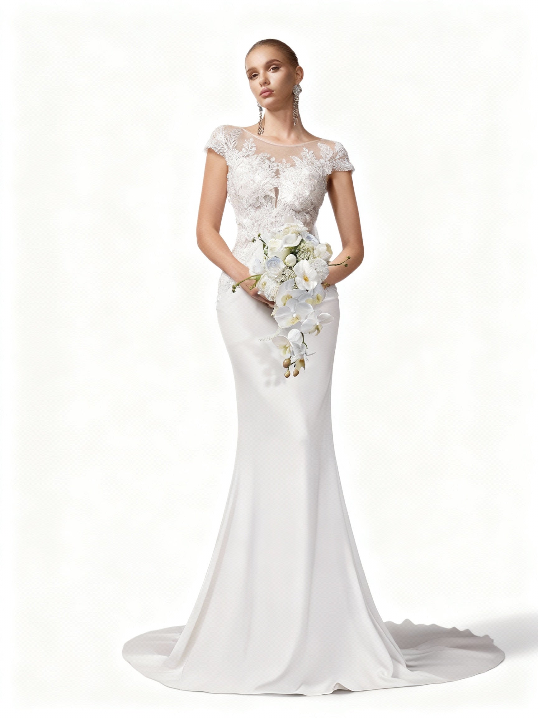 Ein zartes weißes Brautkleid mit edler Spitze und einem klassischen Rundhalsausschnitt. Die feminine Silhouette sorgt für einen romantischen, zeitlosen Look.